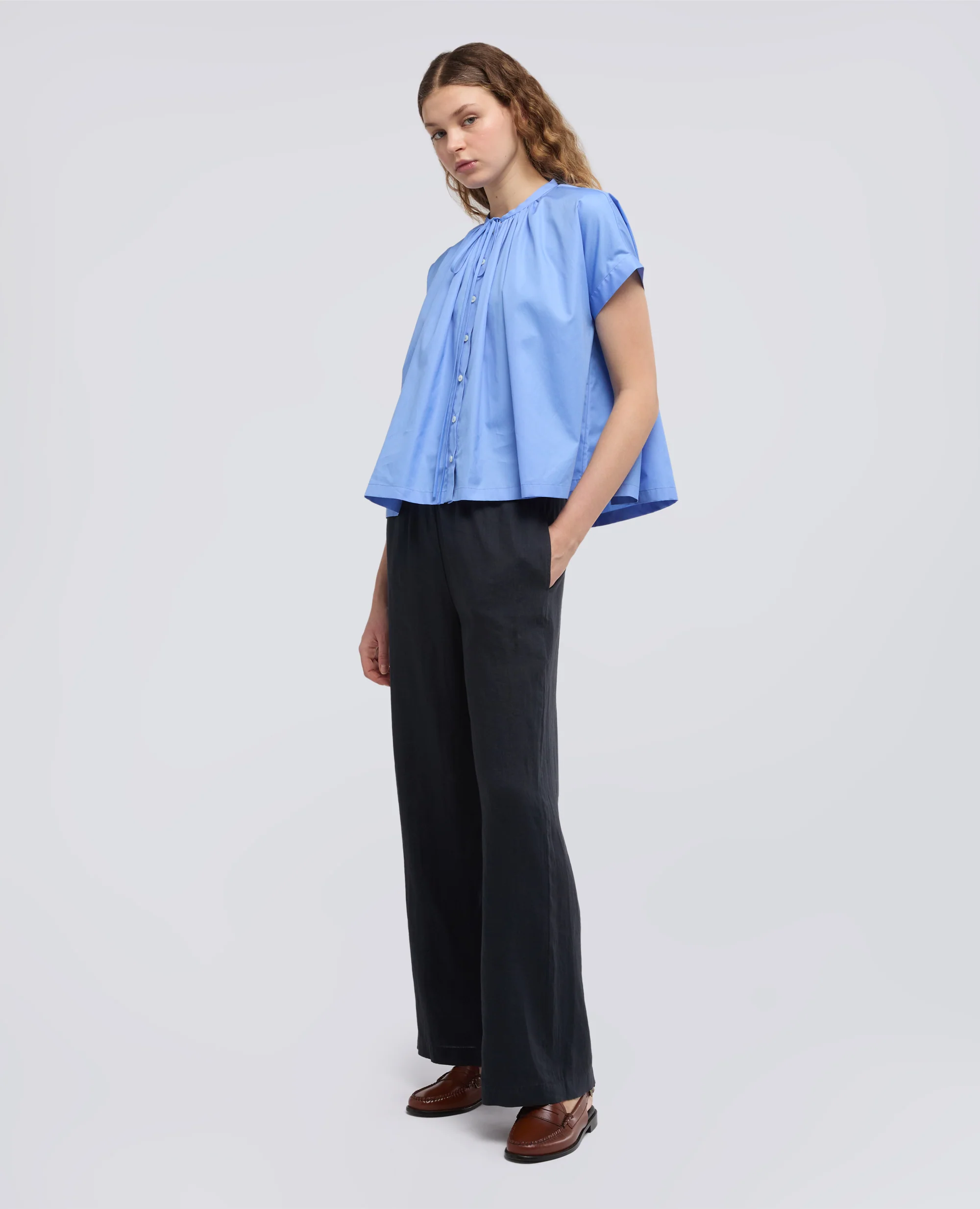 Poplin-Hemd mit Guru-Kragen und Schnursenkeln. Rafft sich am vorderen Ausschnitt und an der Ruckseite. Knopfverschluss. Kurzarmel mit Kante. Aufgeflammter Korper. Locker sitzend.