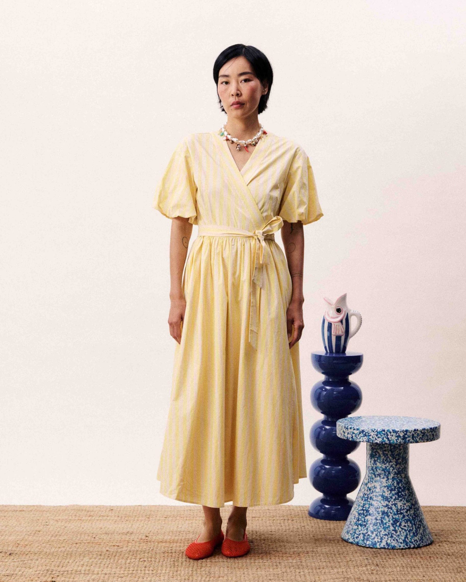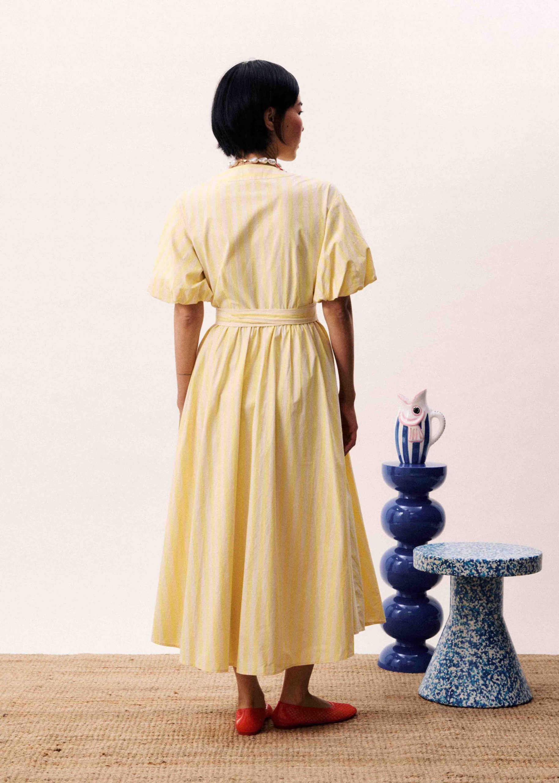 Midikleid mit vertikalen Streifen und einem Bindegürtel in der Taille.